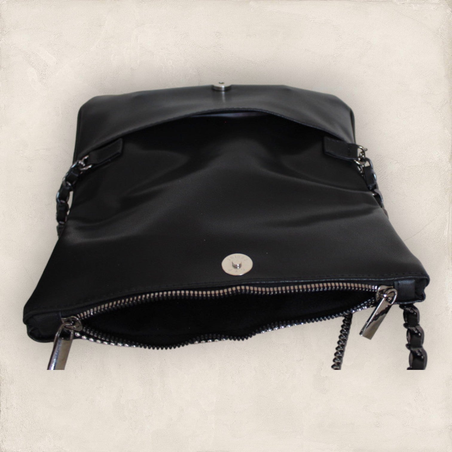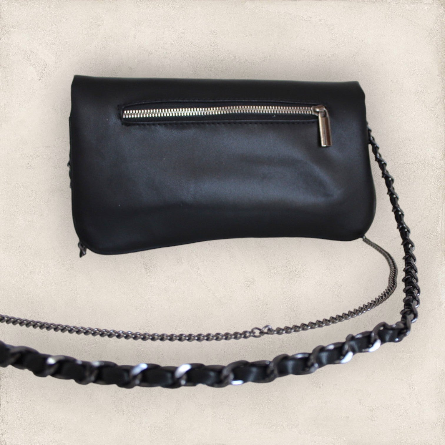 Descripción: Bolso mediano de forma rectangular con 3 compartimientos y 2 correas de cadena una de 1.20 tejida y otra correa delgada de cadena de 1 metro.
