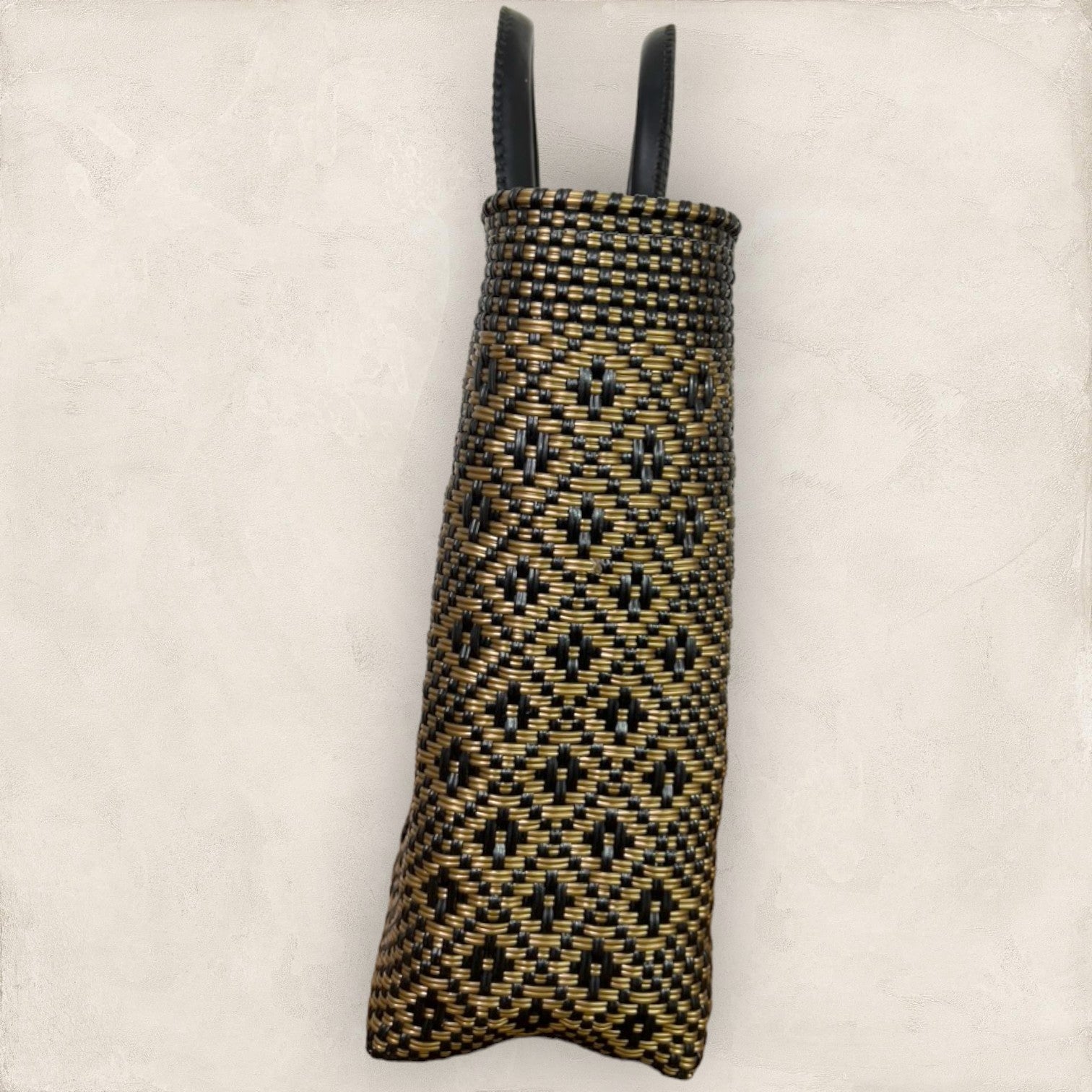 Descripción: Tejido a mano en toquilla de plástico reciclado, con forro interior impermeable, asa forrada de piel vacuno, dije de piel con llavero bañado en chapa de oro.