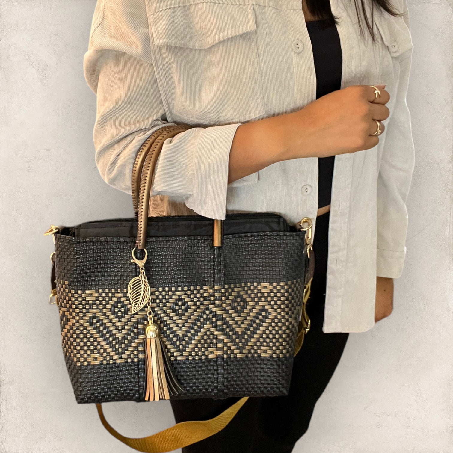 Descripción: Tejido a mano en toquilla de plástico reciclado, con forro interior impermeable, asa forrada de piel vacuno, dije de piel con llavero bañado en chapa de oro, correa extraíble y ajustable de algodón.